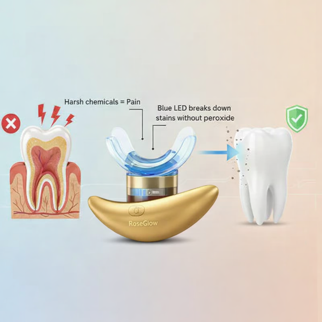 Professional whitening costs $600+ per visit. RoseGlow brings that same LED precision home — for under $90.